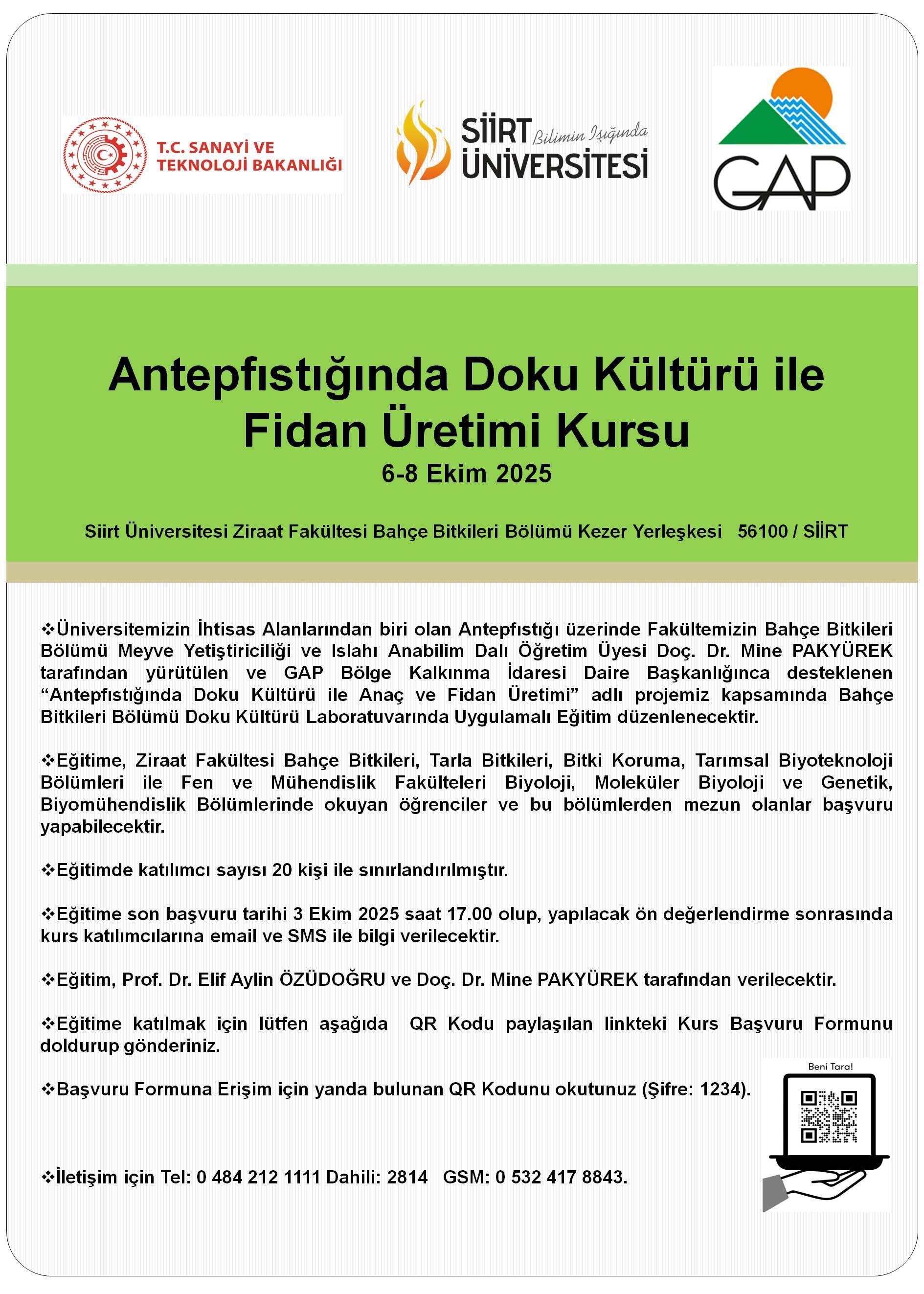 vÜniversitemizin İhtisas Alanlarından biri olan Antepfıstığı üzerinde Fakültemizin Bahçe Bitkileri Bölümü Meyve Yetiştiriciliği ve Islahı Anabilim Dalı Öğretim Üyesi Doç. Dr. Mine PAKYÜREK tarafından yürütülen ve GAP Bölge Kalkınma İdaresi Daire Başkanlığınca desteklenen “Antepfıstığında Doku Kültürü ile Anaç ve Fidan Üretimi” adlı projemiz kapsamında Bahçe Bitkileri Bölümü Doku Kültürü Laboratuvarında Uygulamalı Eğitim düzenlenecektir.