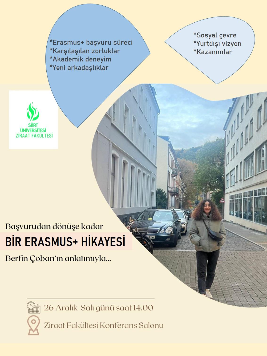 01.09.2023-31.10.2023 tarihleri arasında Erasmus+ Staj hareketliliği ile Hırvatistan’da Josip Juraj Strossmayer Osijek Üniversitesi (JOSIP JURAJ STROSSMAYER UNIVERSITY OF OSIJEK) Osijek Tarımsal Biyoteknik Bilimler Fakültesi’ne (FACULTY OF AGROBIOTECHNICAL SCIENCES) giden Ziraat Fakültesi Bitki Koruma Bölümü Yükseklisans öğrencisi Berfin ÇOBAN, bu hareketliliğe başvurma aşamasından başlayan Erasmus+ hikayesini tüm aşamalarıyla aktaracak. Erasmus+ sayesinde farklı bir üniversitede bilimsel, akademik çalışmalara katılmakla kalmayıp, sosyal etkinlikler içinde yer aldığını ve dil geliştirme çalışmaları yaptığını anlatacak. Staj hareketliliği sonrası yurtdışında farklı ülkelere gitme ile ilgili tecrübelerini paylaşacak.