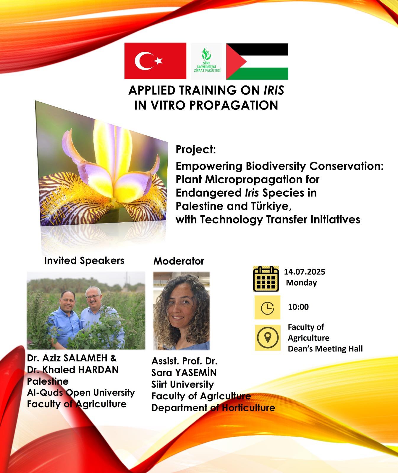 20–23 Ekim 2025 tarihleri arasında Siirt Üniversitesi Ziraat Fakültesinde, Bio-Bridge Initiative Project: Empowering Biodiversity Conservation: Plant Micropropagation for Endangered Iris Species in Palestine and Turkey, with Technology Transfer Initiatives desteğiyle “Uygulamalı Doku Kültürü Eğitimi” etkinliği düzenlenmiştir.